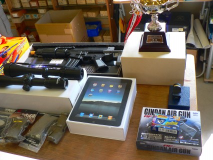 工場内ではイベントの景品がずらっと並んでいます。もちろんこれからまだ増えていく訳ですが、景品台からはみ出すものまで(^^;;;