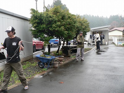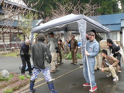 なりさんが持ってきてくれたタープを入り口に設置して雨除け場所を作ります。なりさんありがとうございました。