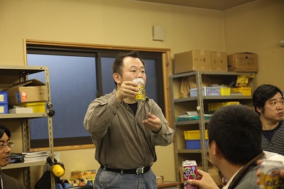 止まらないアイディアやトークを宴会場に移動して話します。ホカ弁と鹿肉とビールがめちゃ美味い!