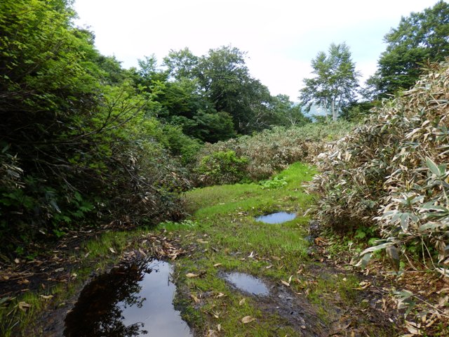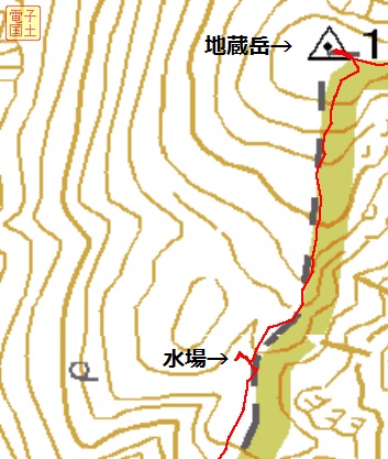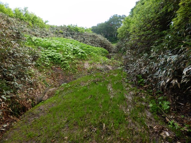 地蔵岳から下る途中、2箇所東の窪地に下る踏み跡がある。残雪がある時