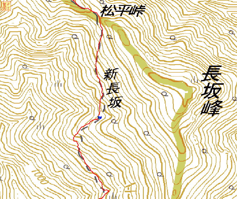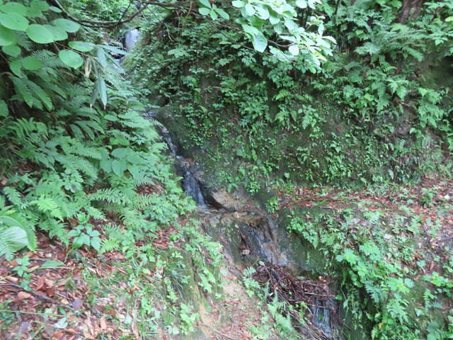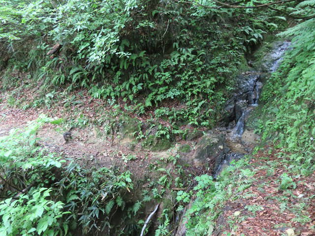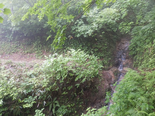 登山道を横切って流れている小沢。すぐ上部に2張り分程度のスペースがある。温い。 |
