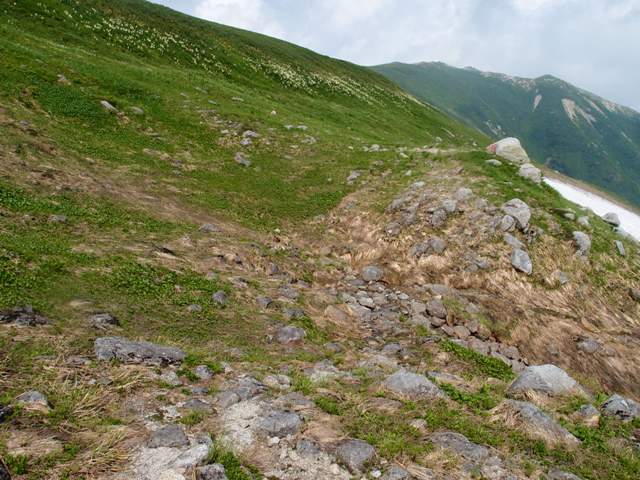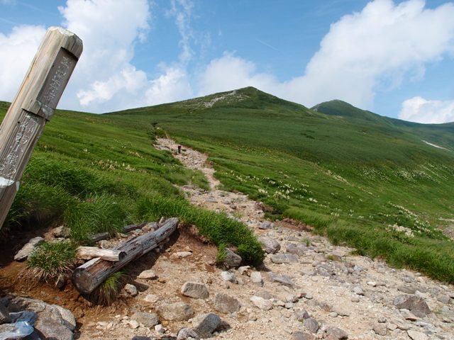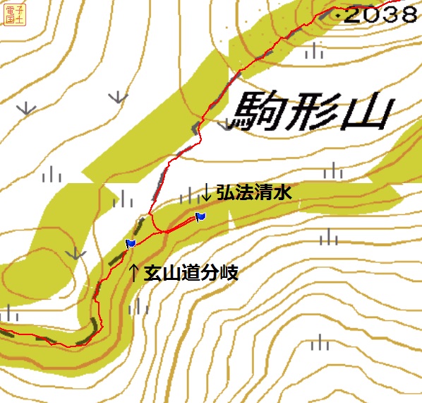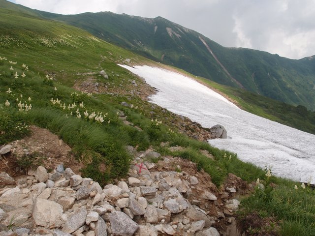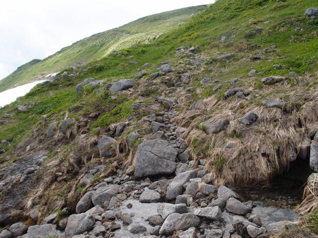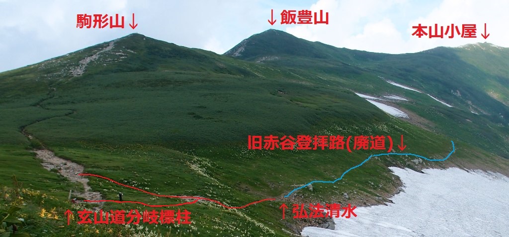 晩夏になると露出する。旧赤谷登拝路の途中にあり、進入禁止のマークが描かれていることもある。信仰登山の時代に は新発田市赤谷から飯豊川沿いに遡って本山(飯豊山神社)に至る道があった。神社が目的地だったので、現在の三角点 は通らなかった。三角点を通る道はダイグラ尾根から登って神社に至る道であった。藤島玄氏が「三角点を経由して縦走す る登山道があったら良い」と言い始めてできた道が、三角点と玄山道を結ぶ道である。「玄さんが言い始めた登山道」がいつ しか「玄さん道」となり現在の「玄山道」になったと、飯豊鉱泉の小椋氏から聞いたことがある。 玄山道分岐の標識から片道約7分。標識の標高1,965m、水場1,942m、標高差23m。 |