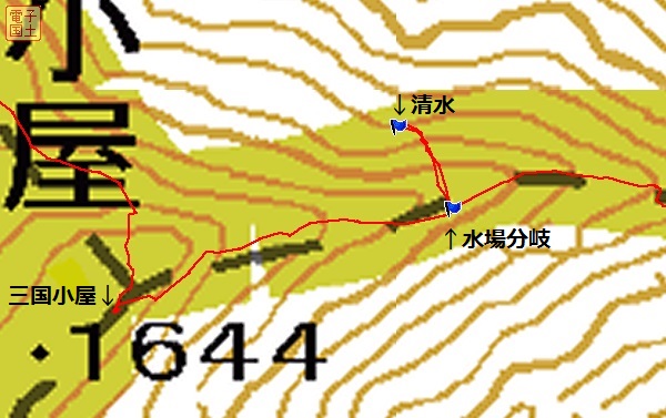 約3分。小屋の標高は1,644m、分岐1,614m、水場1,594m。分岐から水場まで
