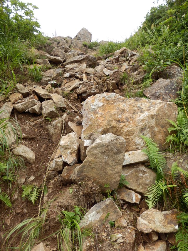 分岐を見上げると岩がグズグズ状態