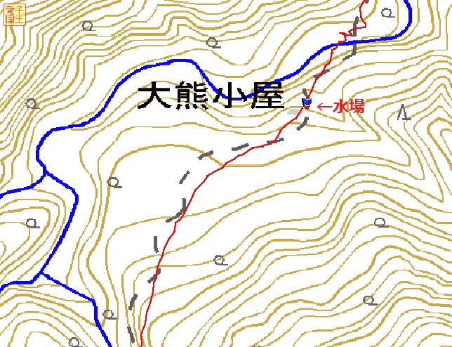 小屋の直ぐ前の小沢が水場になっているが、調査時点では付近の刈払が