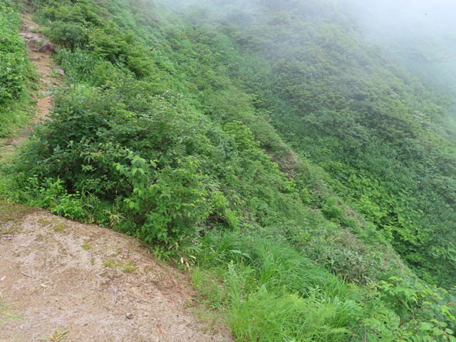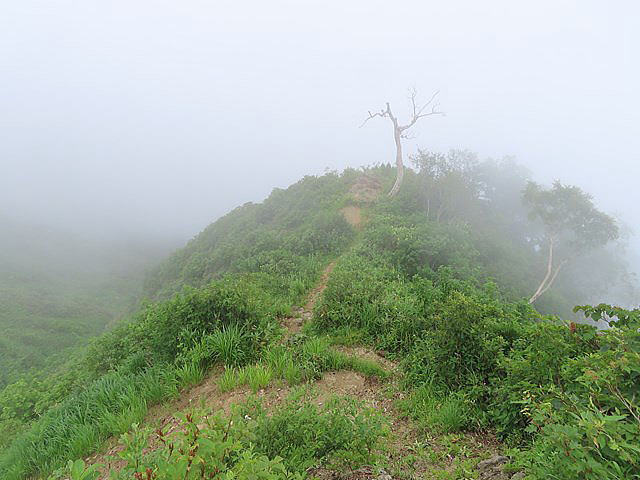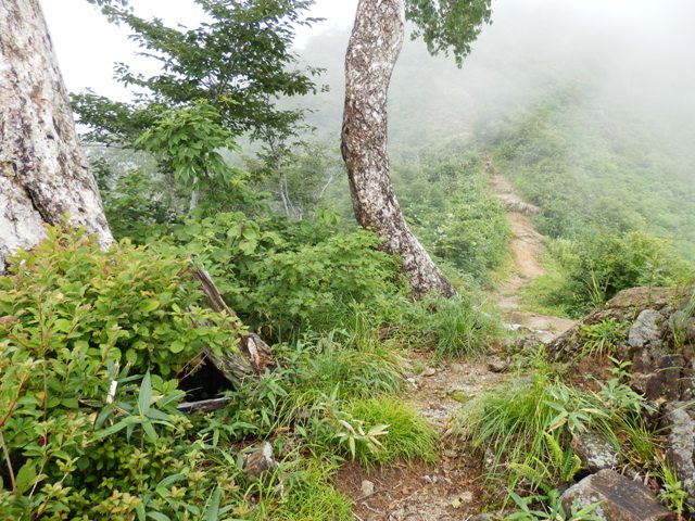 水場への道は廃道となり使用できない。目印のダケカンバも1本となり、枯れている。 |