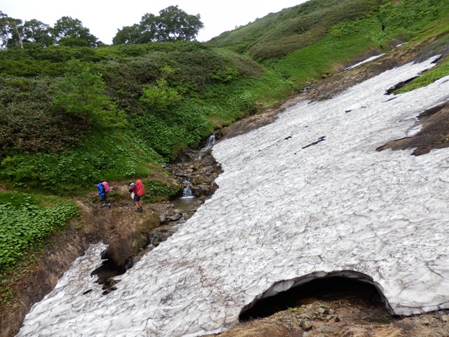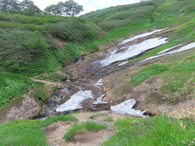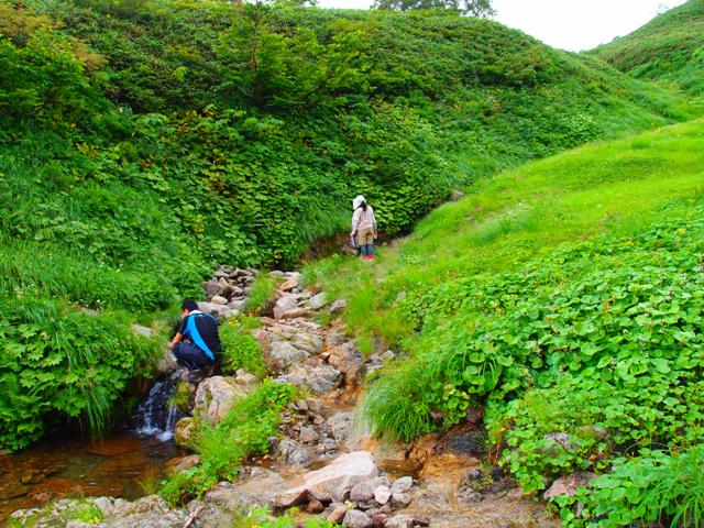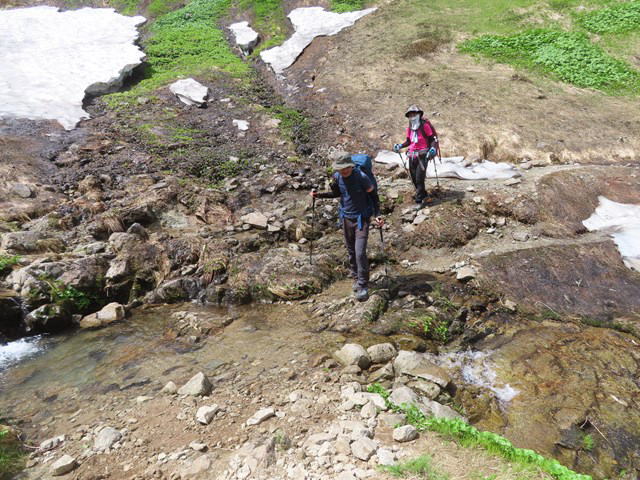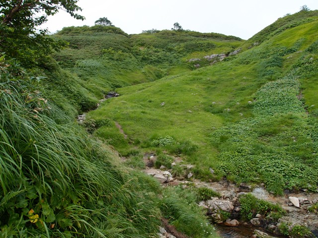 御沢分れからそのまま尾根を詰め、右手に下って横断する小沢である。遅くまで残る残雪がなくなると一面高山植物のお花畑になることに仮称のいわれがある。 |