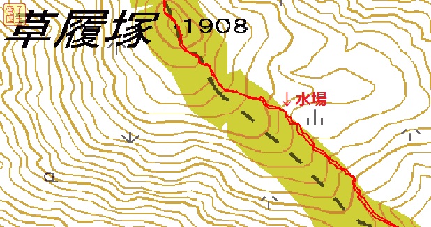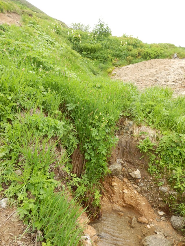 草履塚に登る途中1,840m、登山道脇に沢が流れている。